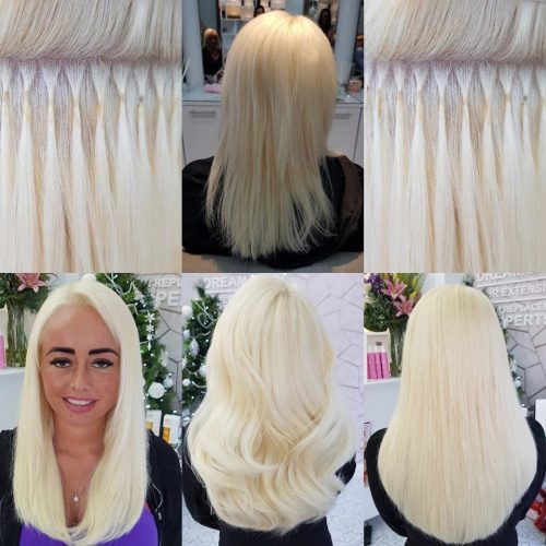This technique involves taking a small section of the client’s hair and applying a single extension strand which is equal in size and bonding it to the natural hair by heat fusion. This is built up row by row until the finished look is complete.